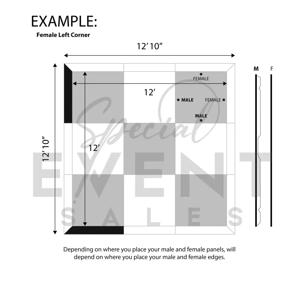 This female left corner edge is apart of our premium event dance floor DancePro collection. Engineered for rental companies, venues, event planners and performers. Whether you're building a dance floor for weddings, corporate galas, parties, outdoor use or studio use, these edges/ trim deliver the perfect blend of aesthetic appeal and structural integrity.