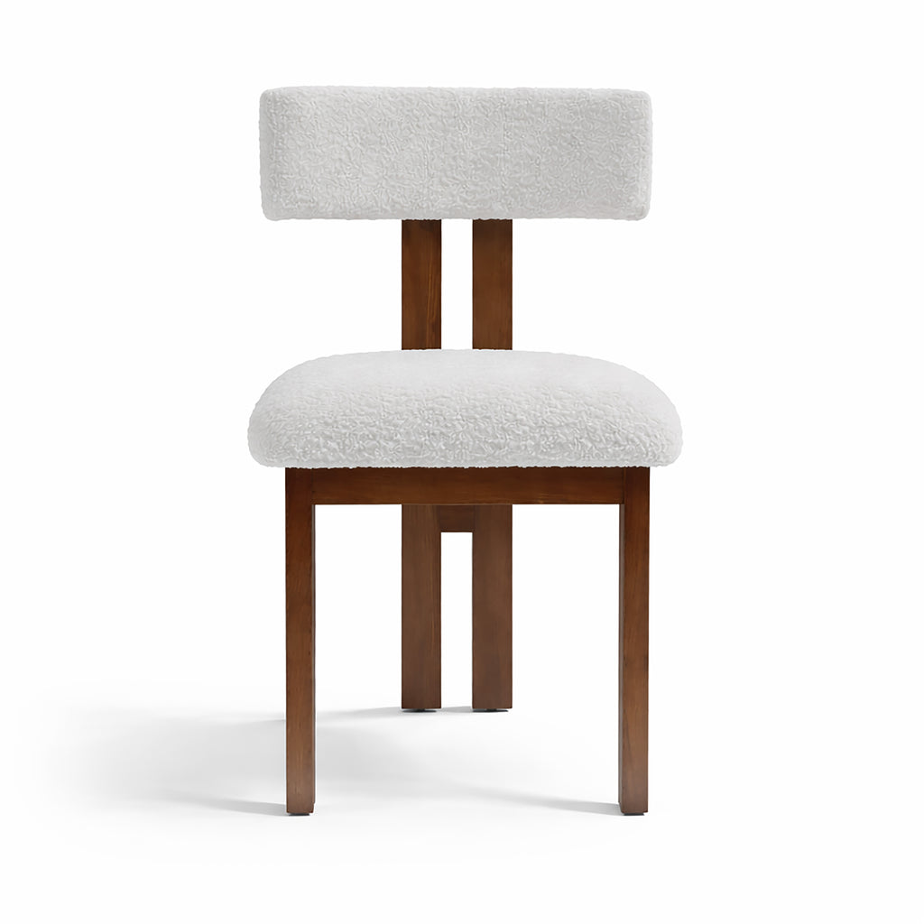 This sculptural dining chair balances mid-century influence with a clean, modern silhouette. Crafted from solid rubberwood and upholstered in soft bouclé fabric, it offers both durability and everyday comfort.