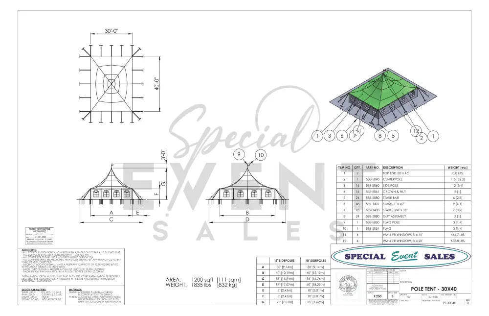 Pole tents are the classic wedding tent. With high peaks and flowing lines our pole tents add elegance to any event. Quick setup, dense storage, and superior durability make Special Event Sales' pole tents and excellent addition to your venue or rental inventory. Available in 30', 40' and 60' widths with lengths starting at 40' feet. Add mid sections to increase the size of the tent by 20' increments.