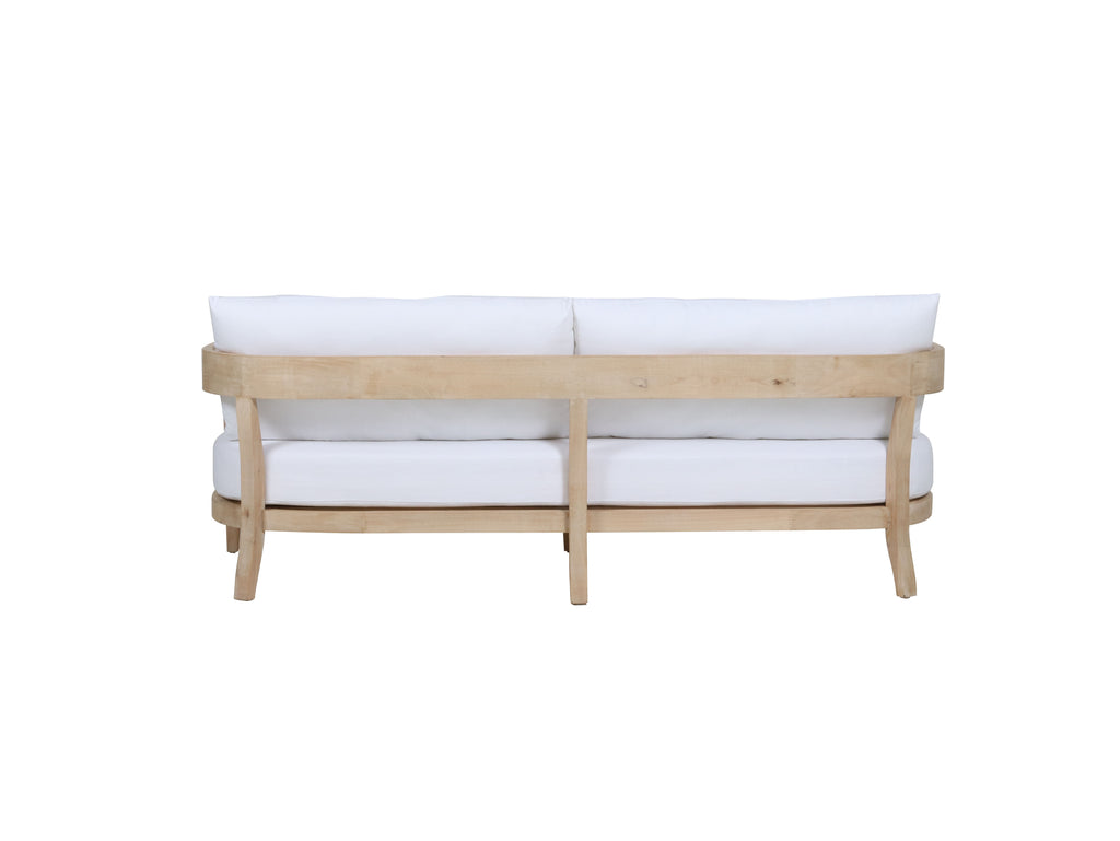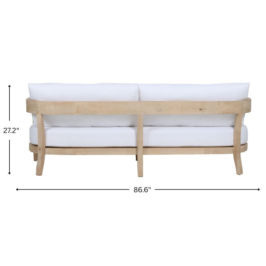 This collection features a gently curved silhouette that offer a study in refined proportions and timeless simplicity. Handcrafted from solid rubberwood valued for its eco-friendly sustainability and durable tight grain the frame provides a sturdy, stable foundation that naturally resists warping over time. The sofa is upholstered white linen, a breathable and hypoallergenic natural fiber that offers superior temperature regulation, staying cool in summer and warm in winter.