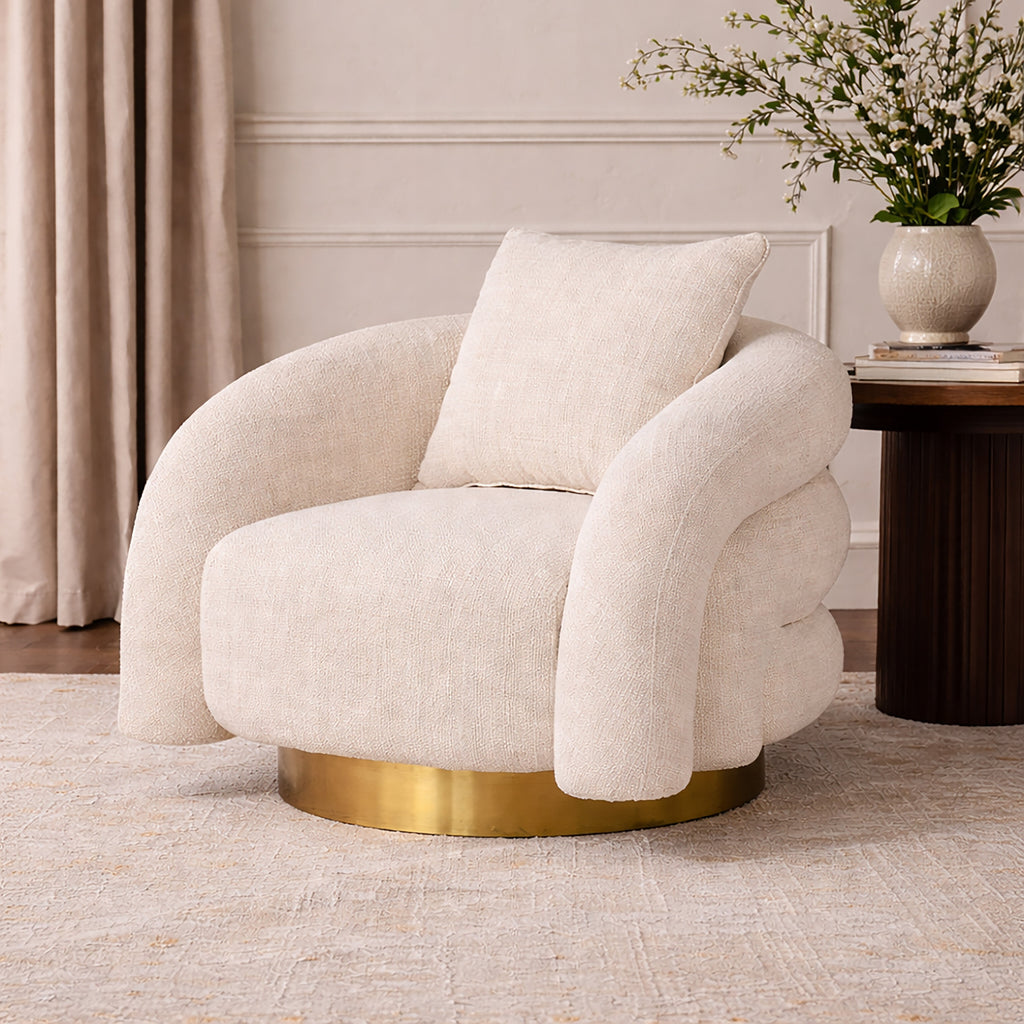 The wrap-around backrest and 360° rotating swivel base create an inviting, supportive seat while maintaining a sleek, contemporary silhouette. Supported by a robust internal frame and foam cushioning, this swivel barrel chair serves as the perfect statement piece for residential spaces, hotel lobbies, and professional wellness/ therapy offices.