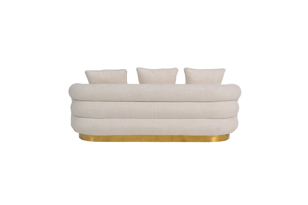 This accent sofa is defined by its channeled wrap-around backrest that creates a deep, "cocoon-like" seating area, perfectly upholstered in soft, high-performance white velvet fabric. The striking aesthetic is anchored by a continuous stainless steel base in a gold finish, providing a high-shine metallic accent that elevates the piece into a work of functional art. Engineered with an interior frame and foam cushioning, this sofa offers a firm yet plush lounging experience that retains its sophisticated shape over time. Whether placed in a chic residential lounge or a commercial boutique, its blend of white velvet and glowing gold accents ensures a timeless, upscale atmosphere.