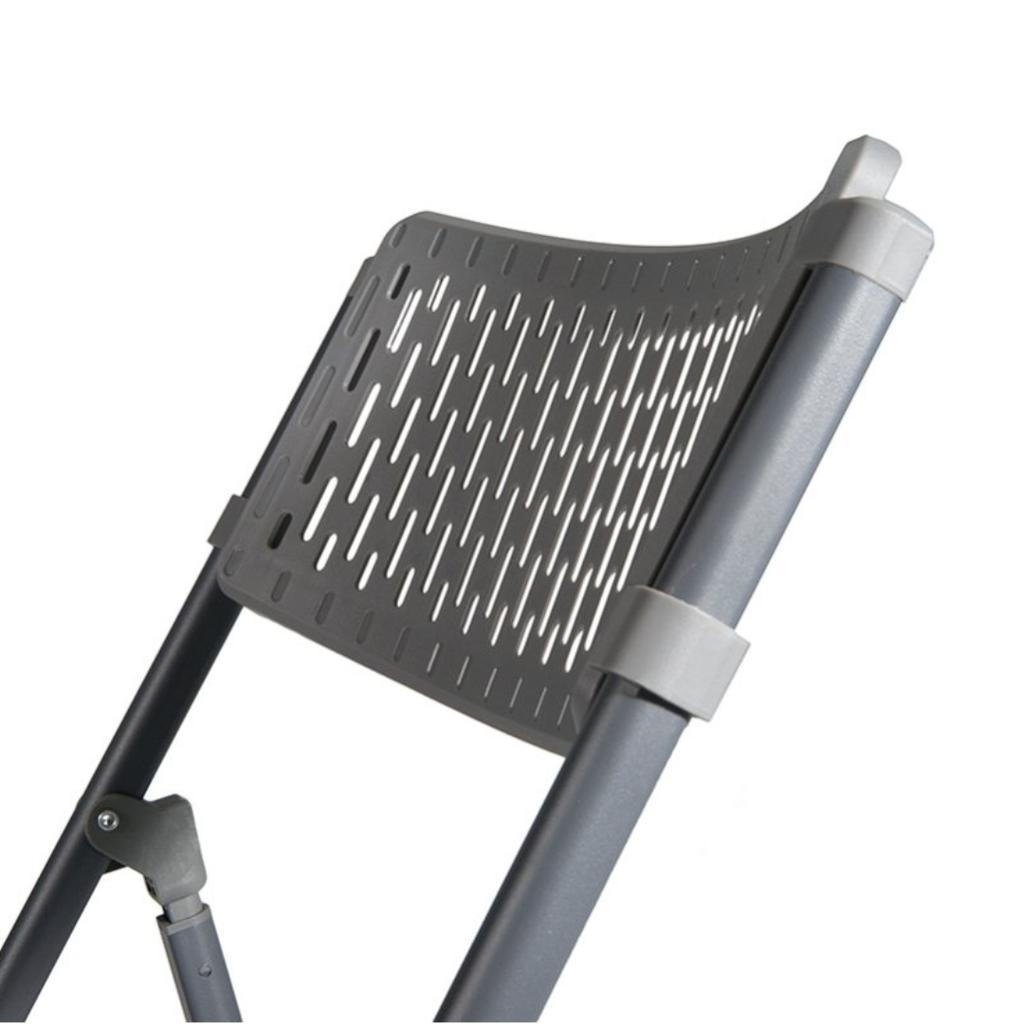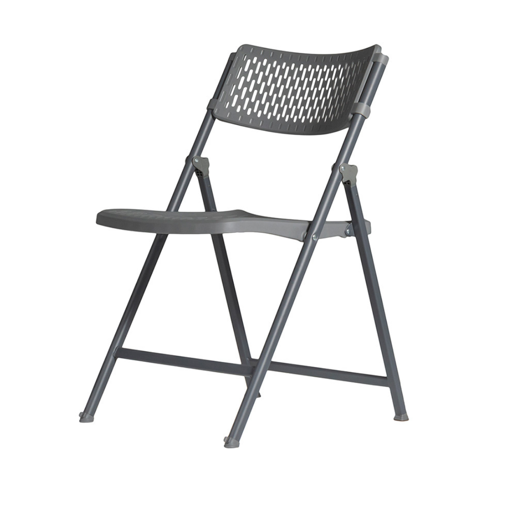 Folding chair with seat and backrest in injected polypropylene in the shape of a slightly flexible and ergonomic mesh that adapts to the body. In addition, the perforated surface gives it breathability and facilitates drainage in case of rain. Folding of the chair with a piston that provides greater safety and avoids snagging points. Very comfortable, lightweight and easy to store. Ideal for events, celebrations and functions that require fast and easy assembly and disassembly. Available in white, black, warm grey and grey.