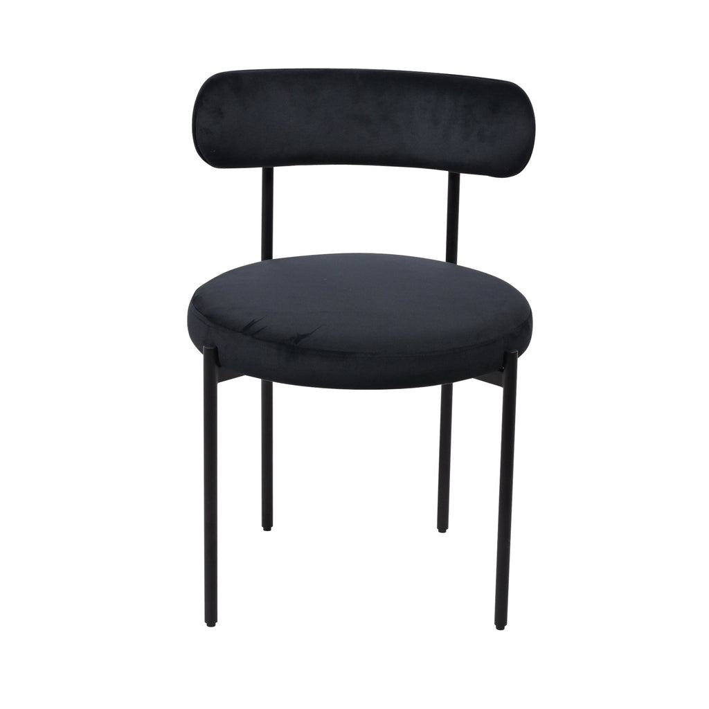 Crafted with a robust matte black metal frame, the chairs feature a chic, contemporary round silhouette that adds an immediate sense of sophistication to any room. Wrapped in velvet fabric including high-fashion "Teddy" textures—the ergonomically curved backrest and high-resilience foam cushioning provide a plush, cocoon-like seating experience designed for long-lasting comfort. The elegant contrast between the black upholstery and the sleek iron legs creates a versatile aesthetic that fits seamlessly into minimalist or transitional interiors.