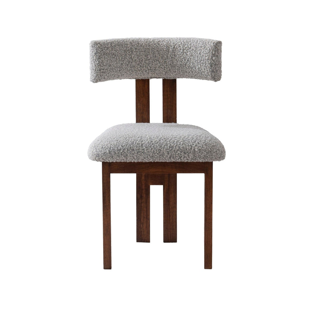 This sculptural dining chair balances mid-century influence with a clean, modern silhouette. Crafted from solid rubberwood and upholstered in soft bouclé fabric, it offers both durability and everyday comfort.