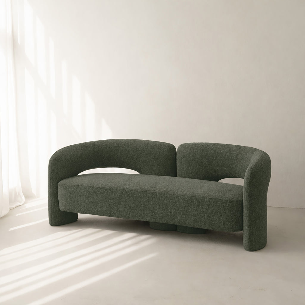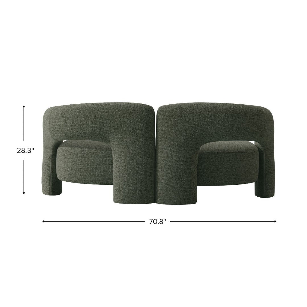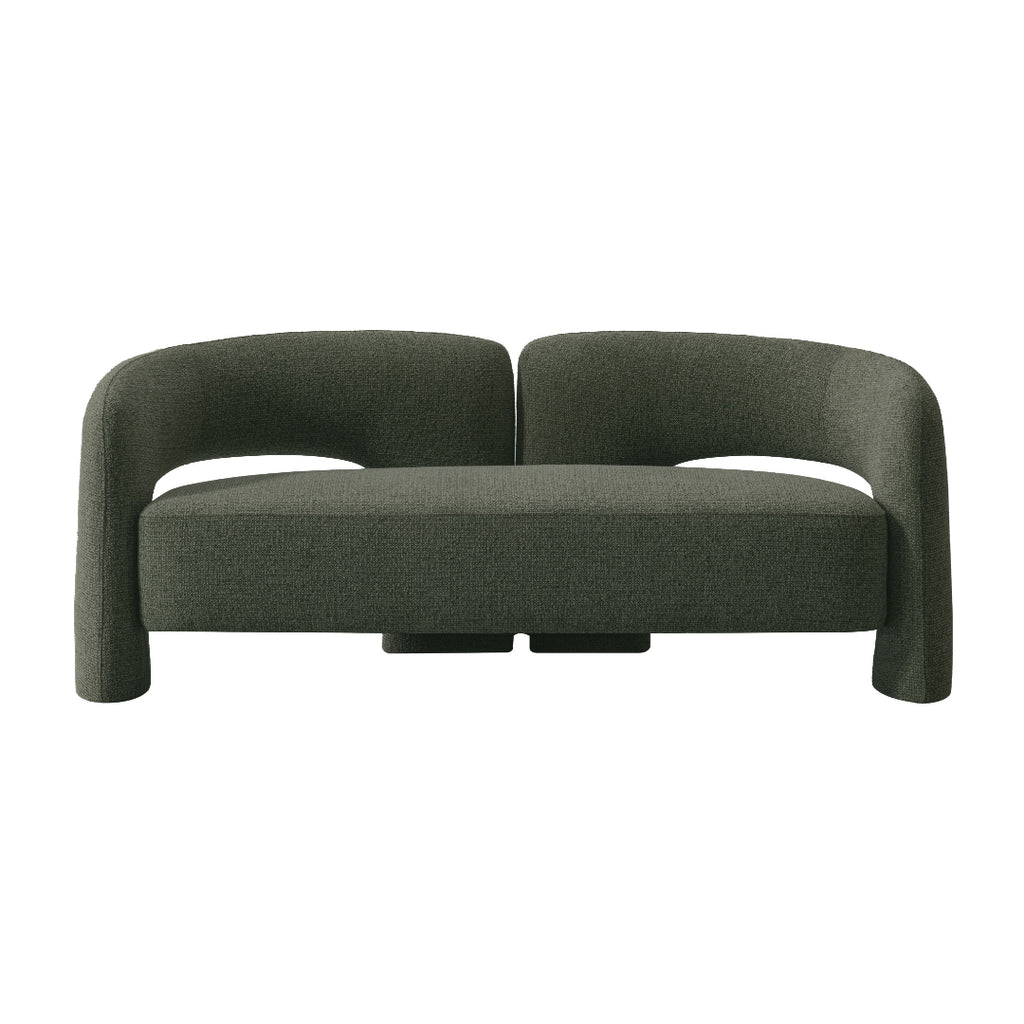 This Double sofa features a chic, low-profile silhouette upholstered, green tight bouclé like fabric that provides a high-fashion, texture while being easy to maintain. The curved backrest and rounded corners create a body-hugging form that maximizes seating comfort for lounging or entertaining. Built on a robust interior frame of solid wood and supported by high-resilience foam, this piece offers a firm. Its neutral gray tone and timeless, looped fabric ensure it complements a wide variety of interior palettes.