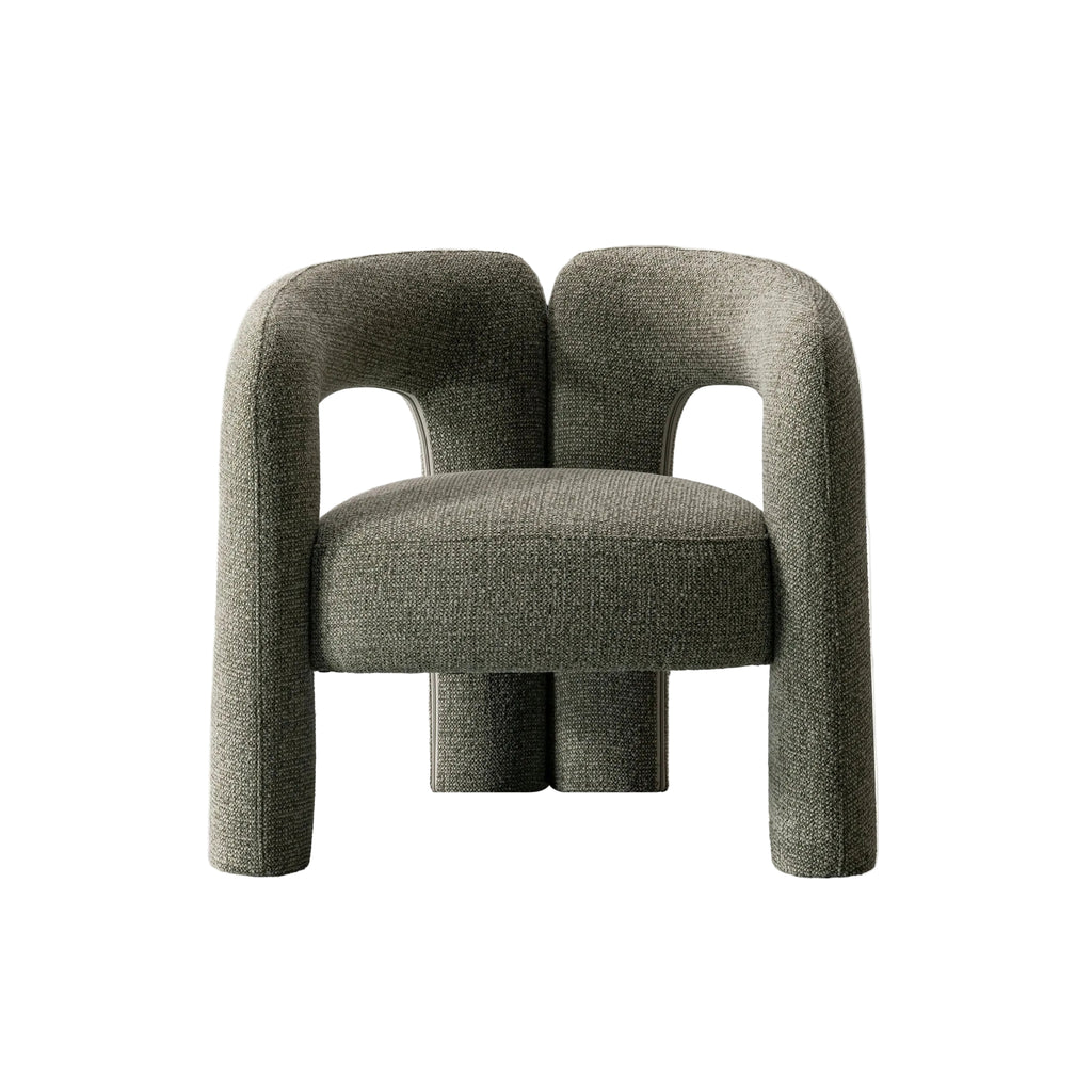 This armchair features a spacious, open-concept silhouette upholstered in gray bouclé-style polyester, offering a tactile, cloud-like texture that remains durable for everyday use. Its unique design showcases a cradling backrest that seamlessly flows into integrated armrests, providing a "total embrace". Built on a sturdy solid plywood frame, the Elo is a versatile statement piece equally suited as a luxurious reading nook chair, a sophisticated office companion, or a singular focal point in a minimalist interior.