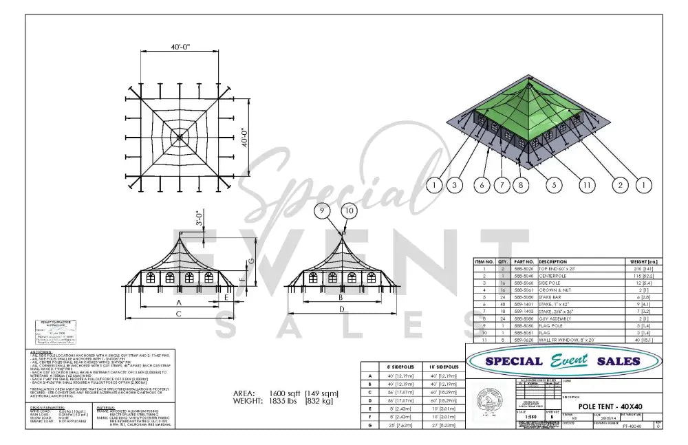 Pole tents are the classic wedding tent. With high peaks and flowing lines our pole tents add elegance to any event. Quick setup, dense storage, and superior durability make Special Event Sales' pole tents and excellent addition to your venue or rental inventory. Available in 30', 40' and 60' widths with lengths starting at 40' feet. Add mid sections to increase the size of the tent by 20' increments.